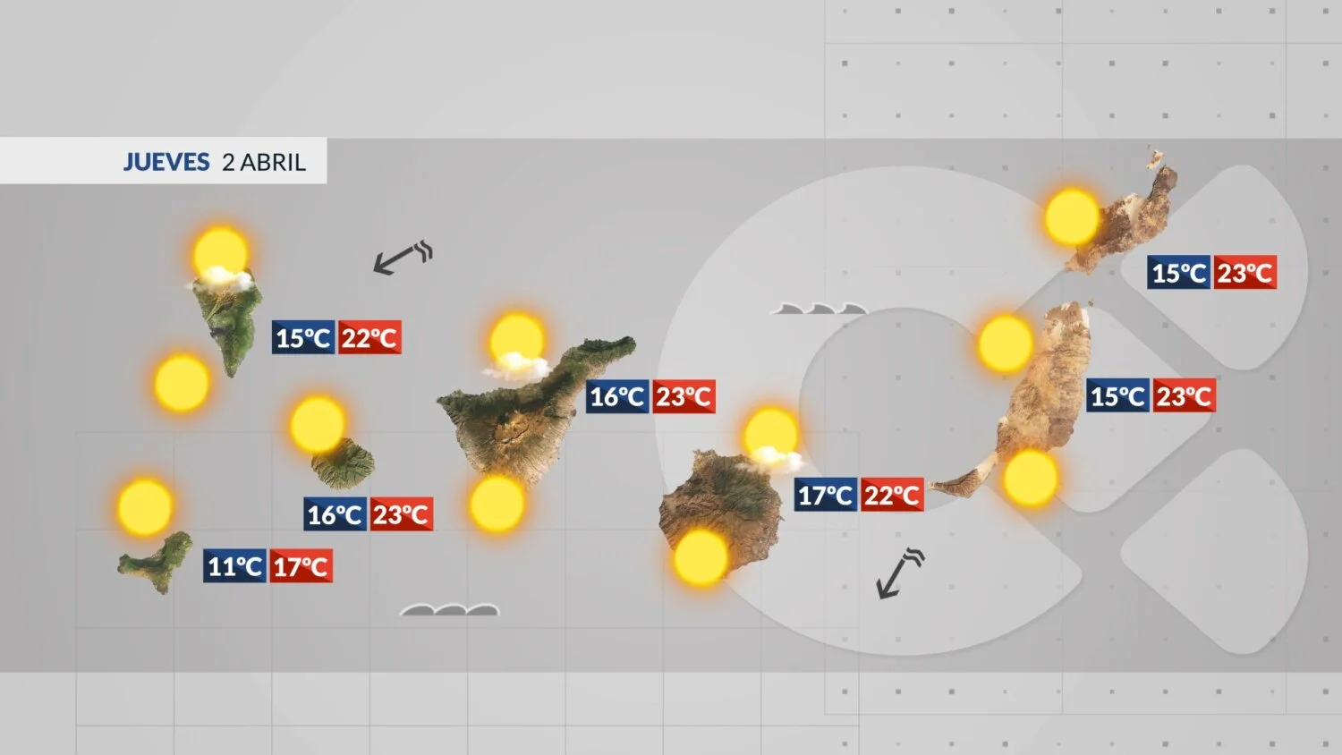 Czwartek 2 kwietnia przynosi stabilną i przyjemną pogodę na Wyspach Kanaryjskich. Pył saharyjski, który unosił się w powietrzu, ma tendencję do zanikania. Na północy i północnym wschodzie wyższych wysp oraz w niektórych punktach Fuerteventury, Lanzarote i La Graciosa mogą pojawić się niskie chmury. W pozostałych rejonach niebo będzie przeważnie bezchmurne.