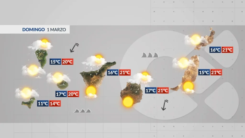 Dzień z niską zachmurzaniem na północy i zachodzie. Nie można wykluczyć słabych opadów. Wiatr alizowy umiarkowany, z silnymi porywami na skrajnym północnym zachodzie i południowym wschodzie. Temperatury w lekkim spadku. W Santa Cruz de Tenerife maksymalnie około 21°C.