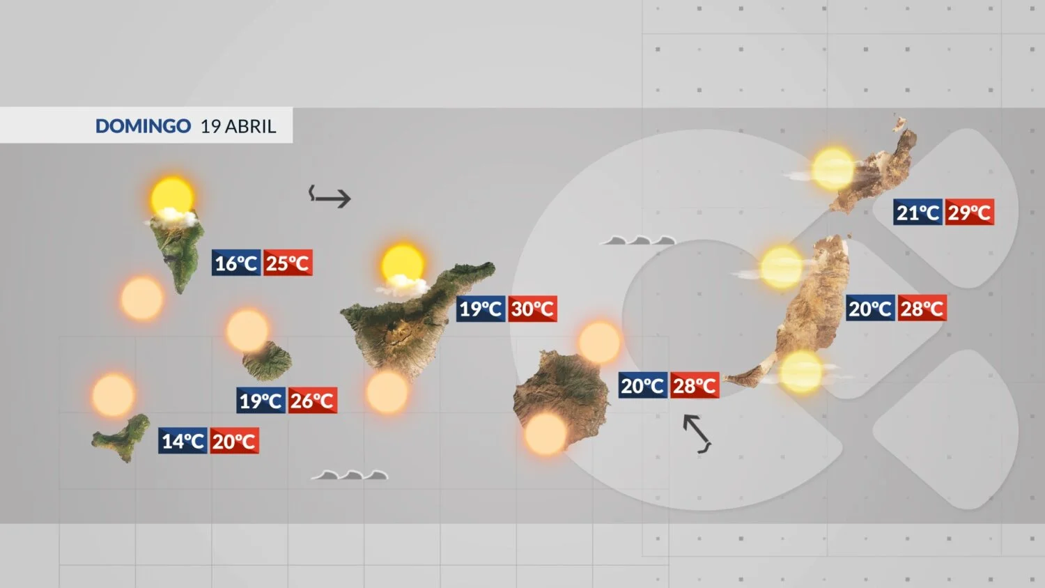 Niebo będzie zmienne, z przelotnymi chmurami średniego i wysokiego piętra, które z czasem powinny się przejaśnić. Nie można wykluczyć pojedynczych, słabych opadów w postaci kropel z towarzyszącą im lokalną burzą nad Teneryfą i Gran Canarią wczesnym rankiem. Temperatury maksymalne sięgną nawet 34°C w interiorze i na zachodzie wysp wschodnich oraz na południu Gran Canarii i Teneryfy. Wiatr na wybrzeżach słaby do umiarkowanego, początkowo ze wschodu, później zmieni kierunek na zachodni. Na średnich wysokościach i szczytach wiatr umiarkowany do silnego z południa z bardzo silnymi porywami. Ocean będzie lekko wzburzony na północnych wybrzeżach (fale do 1,5 m), a na pozostałych akwenach spokojny (fale do 1 m).