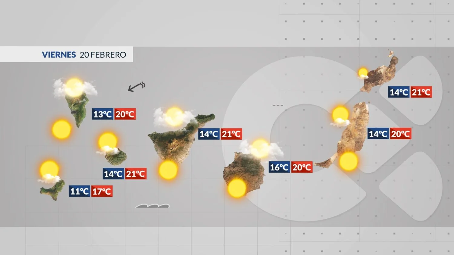 Gran Canaria: Niskie chmury pojawią się na północy i północnym wschodzie, ale szybko stracą na intensywności. Kalima zniknie, a na południu zaświeci słońce. Temperatury od 16 do 20°C.