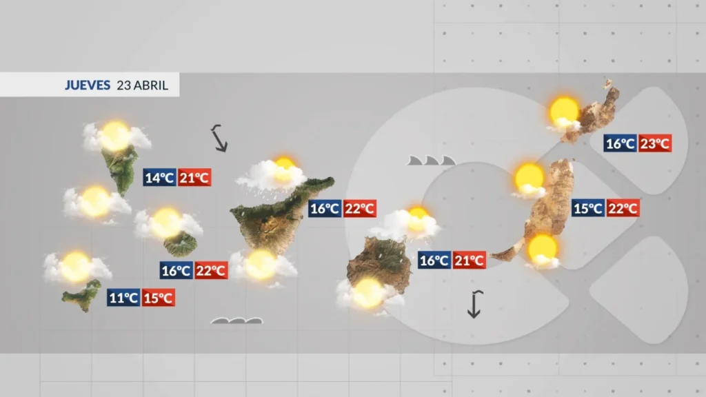 Czwartek 23 kwietnia na Wyspach Kanaryjskich zapowiada się jako dzień z dużą wilgotnością powietrza i niskim zachmurzeniem. Najwięcej chmur i ewentualnych, słabych opadów spodziewanych jest na północnych stokach wysp, zwłaszcza w pierwszej połowie dnia. Temperatury pozostaną stabilne, a wiatr będzie słaby.