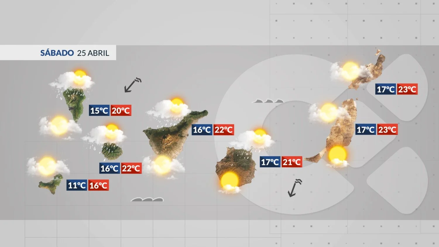 Wiatr alisio będzie umiarkowany, ale w rejonach wystawionych na jego działanie (północny zachód i południowy wschód wyższych wysp oraz we wnętrzu wschodnich) może wzmagać się do silnego. Na północy i północnym wschodzie górskich wysp możliwe są słabe i przelotne opady deszczu. Niewykluczone, że po południu pojawią się one również na południowych stokach. W nocy nad wyspy nasuną się chmury wysokie. Temperatury maksymalne nieznacznie spadną na zachodzie wysp i w południowo-zachodniej części Gran Canarii. Minima będą nieco wyższe, z wyjątkiem Fuerteventury, Lanzarote i La Graciosy, gdzie nie ulegną zmianie. Na Oceanie dominować będą fale z północnego zachodu, które na otwartych akwenach przy La Palmie, Fuerteventurze i Lanzarote mogą sięgać 2 metrów. Na pozostałych wybrzeżach ocean będzie wzburzony.