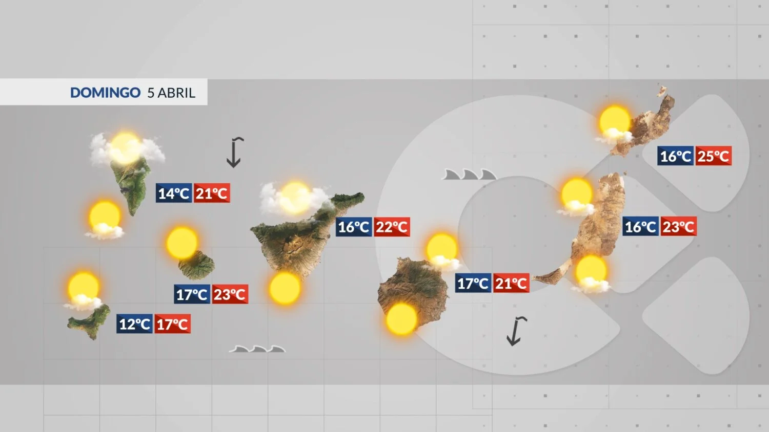 W niedzielę 5 kwietnia na wschodnich wyspach, czyli Fuerteventurze, Lanzarote i La Graciosa, pojawią się przelotne chmury, głównie średnie i wysokie. Na pozostałych wyspach niebo będzie przeważnie bezchmurne, choć popołudniu mogą się rozwinąć lokalne chmury. W skrajnych przypadkach mogą one przynieść pojedyncze, rozproszone krople deszczu, zwłaszcza na północy wysp. Pod wieczór na północy zrobi się bardziej pochmurnie.