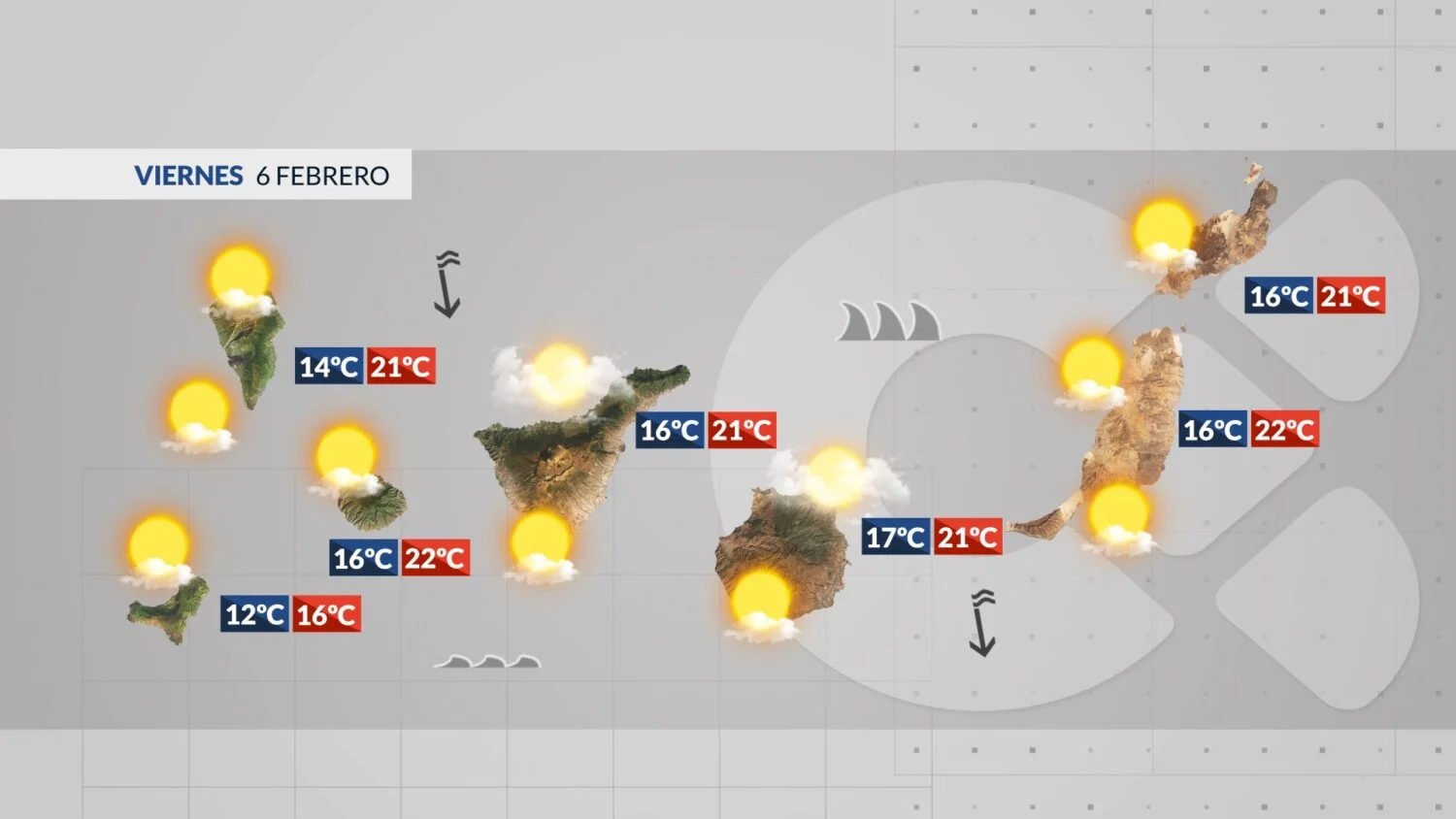 Poranne niskie chmury nad północą i terenami szczytowymi szybko ustąpią słońcu. Na pozostałym obszarze wyspy słonecznie. Na wybrzeżu temperatury przyjemne. Wiatr umiarkowany, z północy.