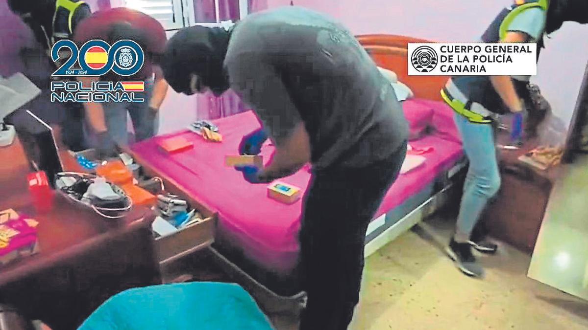 Na tej podstawie funkcjonariusze przeprowadzili jednocześnie cztery przeszukania domów: dwa w Las Palmas de Gran Canaria i dwa w gminie Santa Lucía de Tirajana. Te działania umożliwiły zlokalizowanie siedmiu ofiar. Jeden z zatrzymanych w stolicy Gran Canarii zajmował się, według śledztwa, handlem sprowadzanymi z zagranicy samochodami i działał wraz ze swoją partnerką – mieszkanką okolic Pío Coronado – z garażu położonego w rejonie Barranquillo Don Zoilo.
