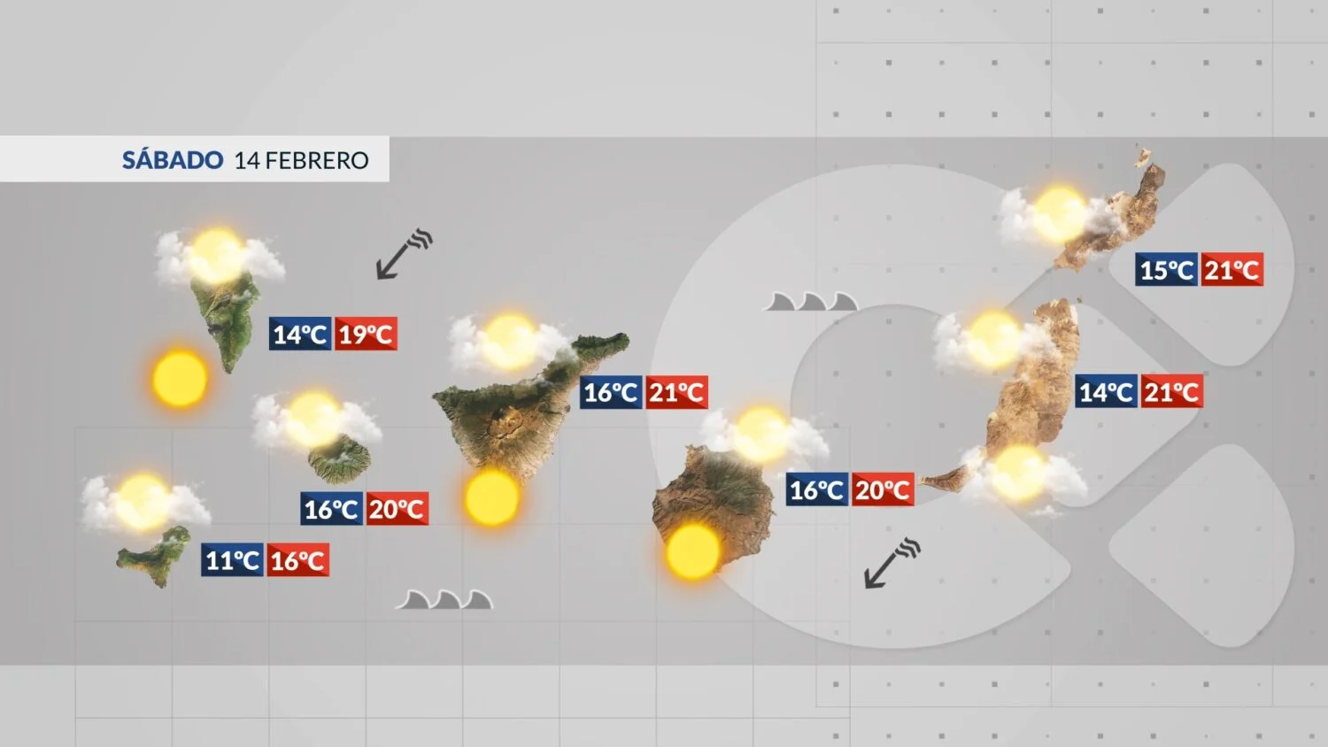 Słonecznie, z wyjątkiem północy i wschodu poniżej 1400 m, gdzie dominować będą chmury. Bardzo silne porywy wiatru w Garafíi, El Paso i Fuencaliente.