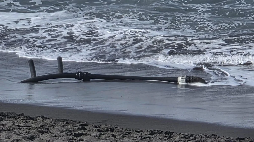 Odkryty fragment ma kształt wylotu lub złącza z gwintem, tych samych rozmiarów i jest praktycznie nieruchomy. Rura ciągnęła się dalej w głąb plaży, a jeśli jakiś plażowicz lub spacerowicz (co na tej plaży jest bardzo częste) jej nie zauważył, stanowiła nawet zagrożenie potknięcia się lub zranienia dla bosych stóp. W lutym, jak pokazują towarzyszące temu tekstowi zdjęcie i film (które szeroko rozeszły się w mediach społecznościowych), rura odsłonięta przez morze w zimie, podczas której plaża straciła lub usunięto znacznie więcej piasku niż zwykle, była znacznie dłuższa i miała kilka uniesionych odgałęzień.